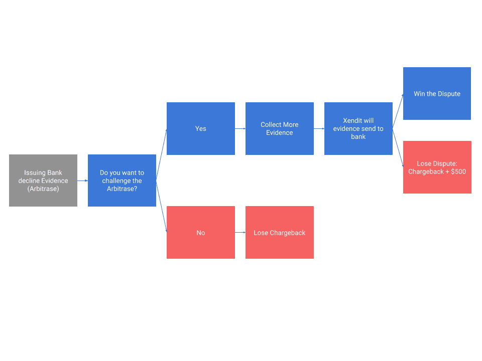 Setelah dua langkah verifikasi bukti, ada kemungkinan issuing bank menolak lagi bukti karena dianggap tidak mencukupi. Dalam kasus ini, issuing bank dapat mengekskalasikan chargeback ke tahap arbitration. Xendit akan diberitahu mengenai arbitration, dan merchant perlu mengambil keputusan untuk melawan arbitration tersebut atau tidak. Jika merchant memilih untuk melawan, maka merchant perlu memberikan bukti tambahan yang akan dikirimkan ke acquiring bank lalu diteruskan ke issuing bank. Apabila merchant menang, maka merchant tidak akan didebet untuk nominal transaksi. Namun apabila merchant kalah, maka merchant akan didebet untuk nominal transaksi + biaya arbitration ($500).