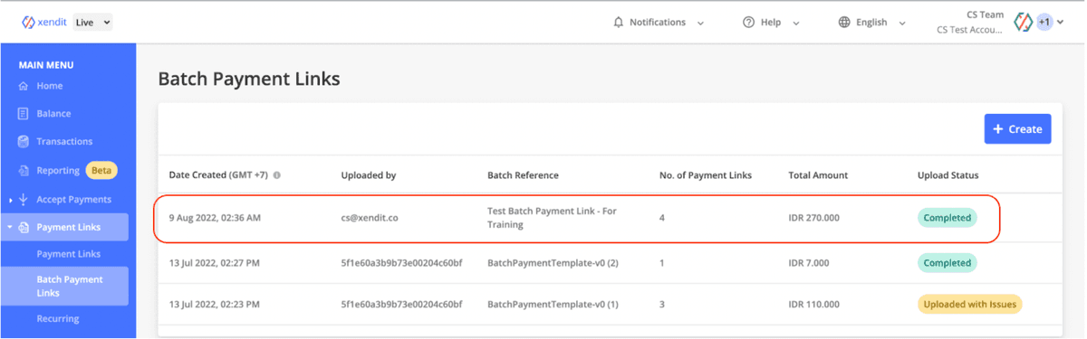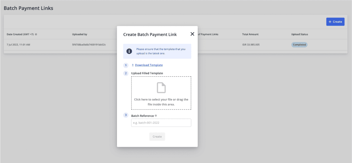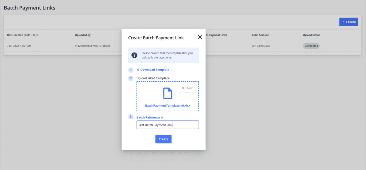 After uploading the excel file, there are three possible statuses batch payment links can have: