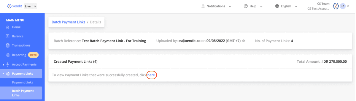 Setelah berhasil membuat Kelompok Tautan Pembayaran, Anda dapat melihat detail dari setiap Kelompok Tautan untuk melihat individual tautan pembayarannya. Klik tombol “disini” untuk mengetahui detailnya.