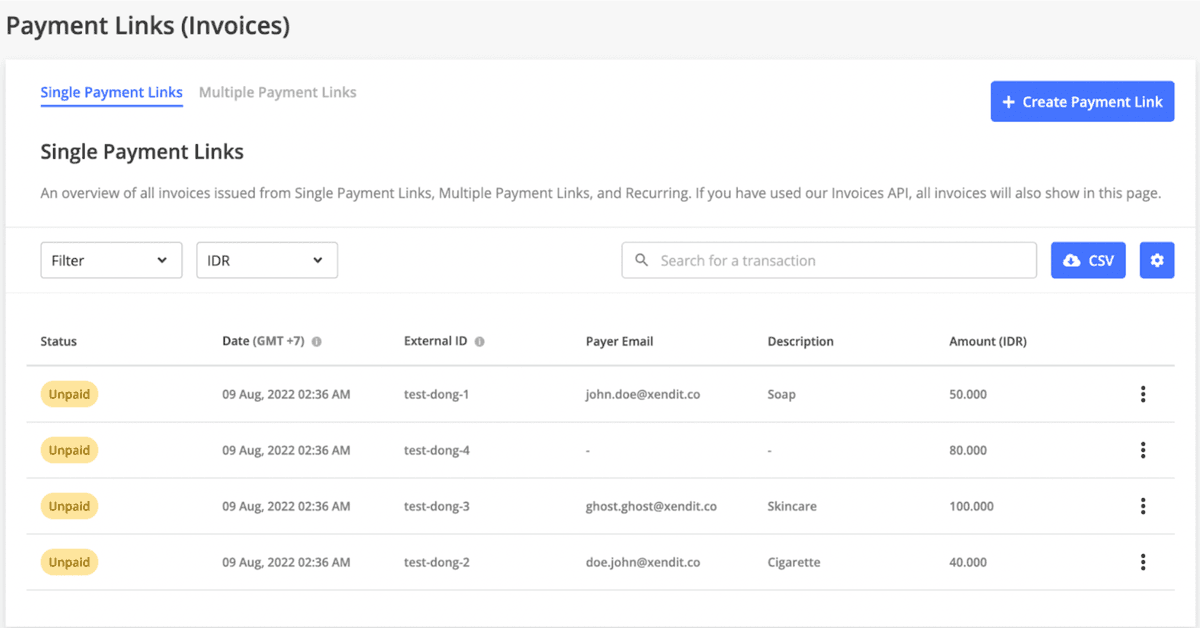 - Tidak ada External ID yang dibuat sama pada satu file. Jika ada duplikasi, kolom yang terduplikasi tidak akan diteruskan dalam pembuatan invoice/tautan pembayaran.