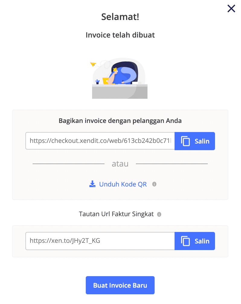 Pada respon sukses setelah pembuatan tautan pembayaran kami menyediakan tautan, QR code, dan tautan pendek yang dapat dibagikan kepada pelanggan Anda