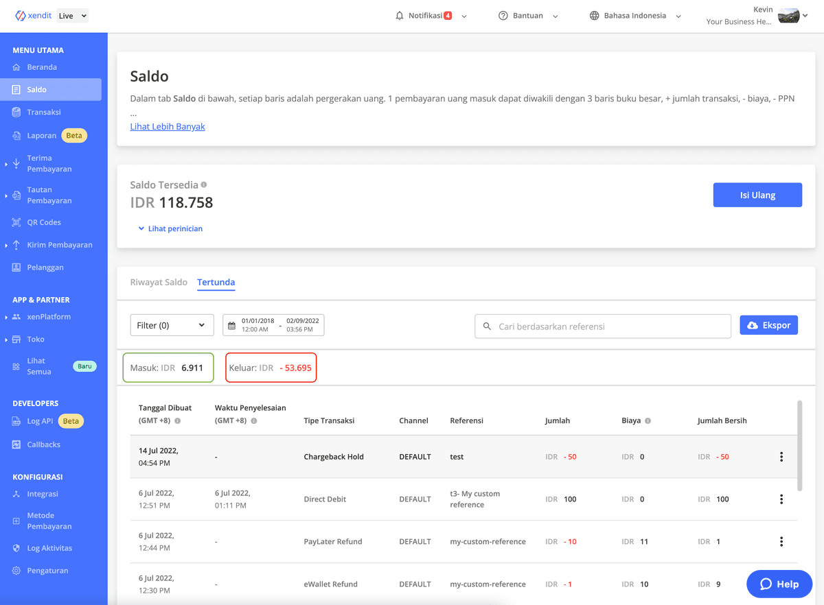 Silakan merujuk ke halaman ini untuk mengetahui cara isi ulang dan halaman ini untuk menarik saldo Xendit Anda.