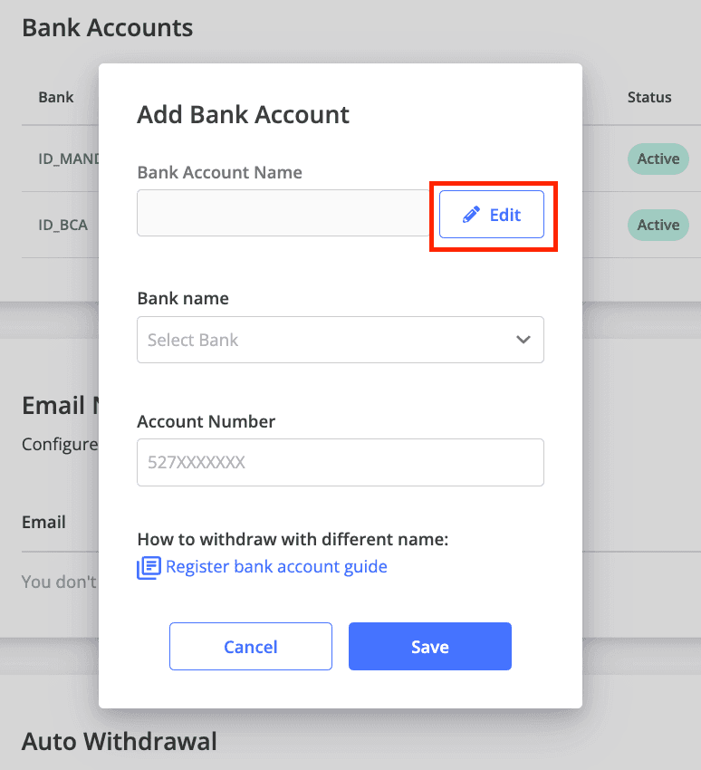 - On your Xendit Dashboard, go to Settings > Withdrawal Settings > Auto Withdrawal
